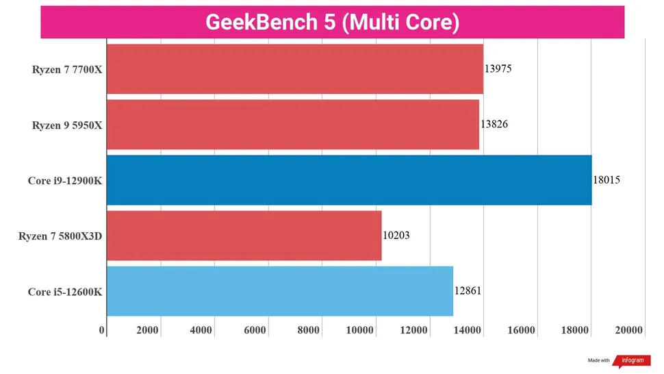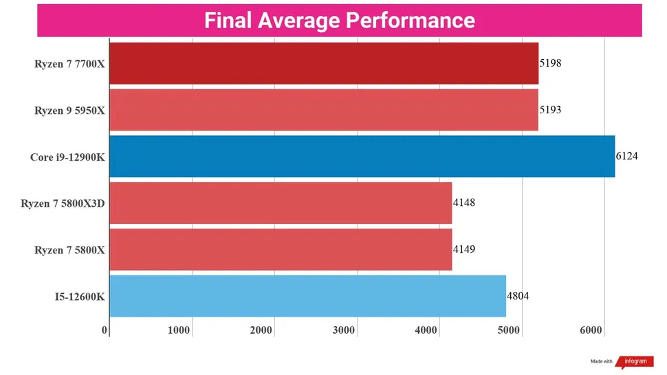 Процессор 7700X действительно уступает i9-12900K только в чистой многоядерной производительности. Восьмиядерный 16-поточный процессор не смог бы победить 16-ядерный/24-поточный чип всего за одно поколение.