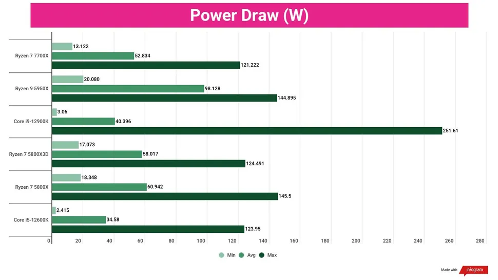 Самое примечательное в производительности Ryzen 7 7700X — это то, что он показывает такие же результаты, как и чипы с таким же или более высоким TDP. За всё время тестирования 7700X потреблял максимум 121,222 Вт и более или менее соответствовал по производительности Ryzen 9 5950X, которому на пике требовалось 144,895 Вт.