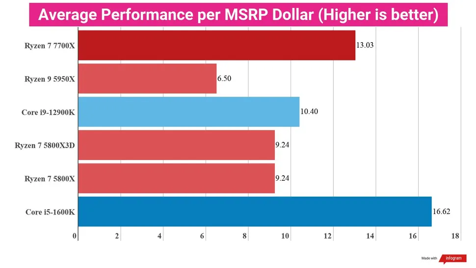По сравнению с Intel Core i7-12700K Ryzen 7 7700X дешевле (или дороже варианта i7-12700KF), и хотя мы никогда не делали подробного обзора Core i7-12700K, сравнивая его с Intel Core i9-12900K, вы можете получить очень конкурентоспособную производительность с Ryzen 7 7700X по сравнению с лучшим процессором Intel вдвое дешевле – и это даже с учетом новой материнской платы AM5 и DDR5, которую вам нужно будет купить.