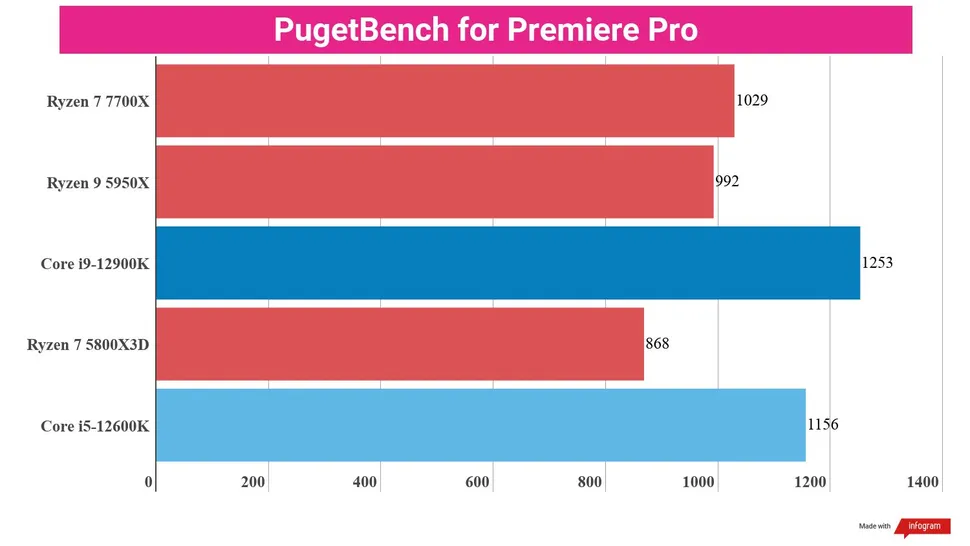 Тем не менее Ryzen 7 7700X одерживает как минимум одну победу, причём с довольно большим отрывом. Он отлично справляется с PugetBench для Photoshop, набрав 1478 баллов против 1396 у Core i9-12900K. Только Ryzen 9 7950X набрал больше баллов в наших тестах (1487), и, честно говоря, на наш взгляд, это вполне в пределах погрешности, чтобы считать результат ничейным.