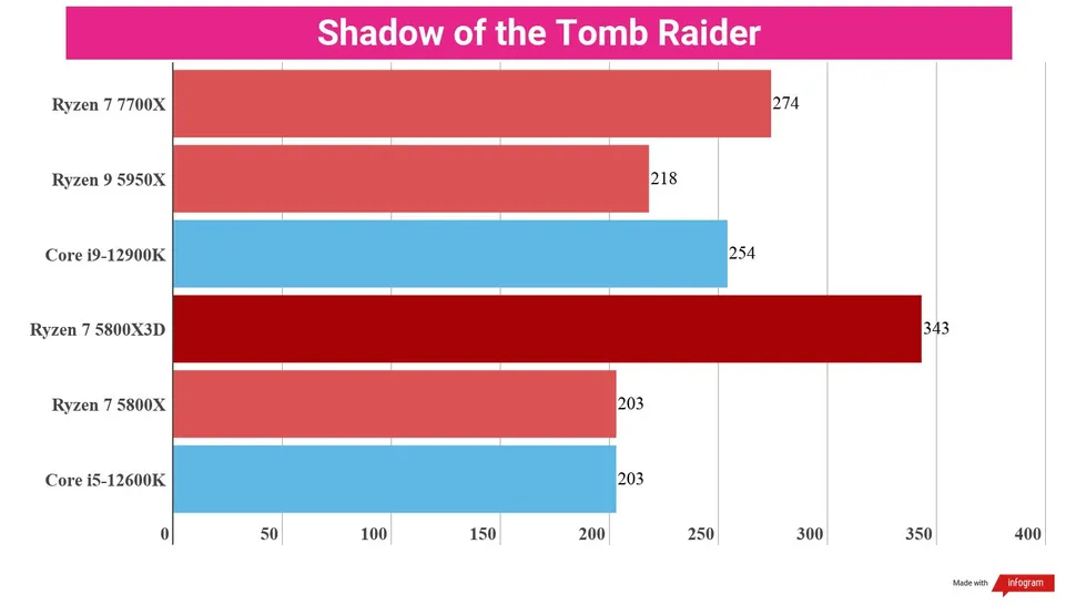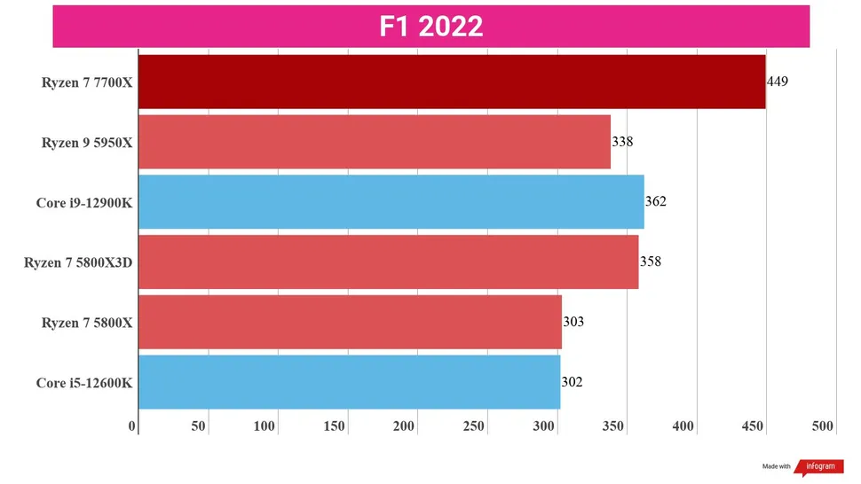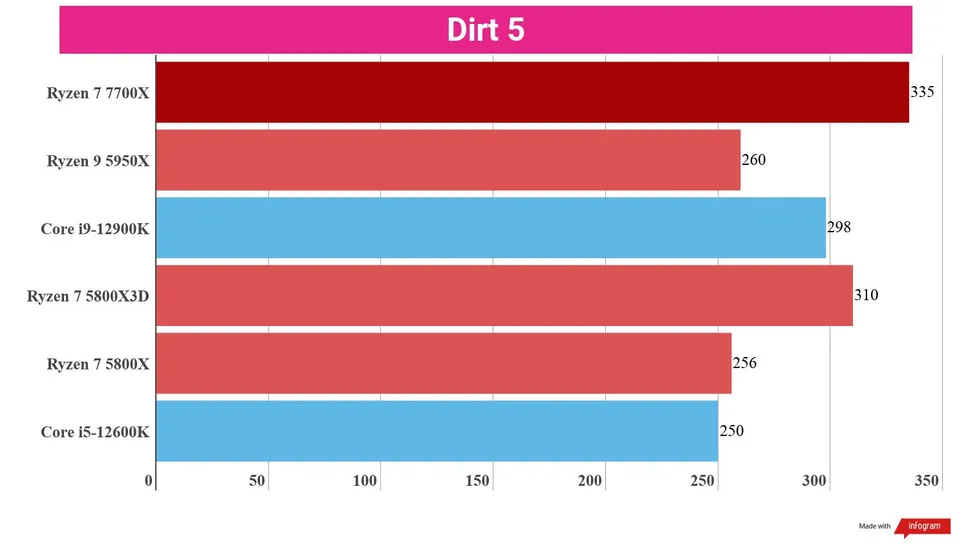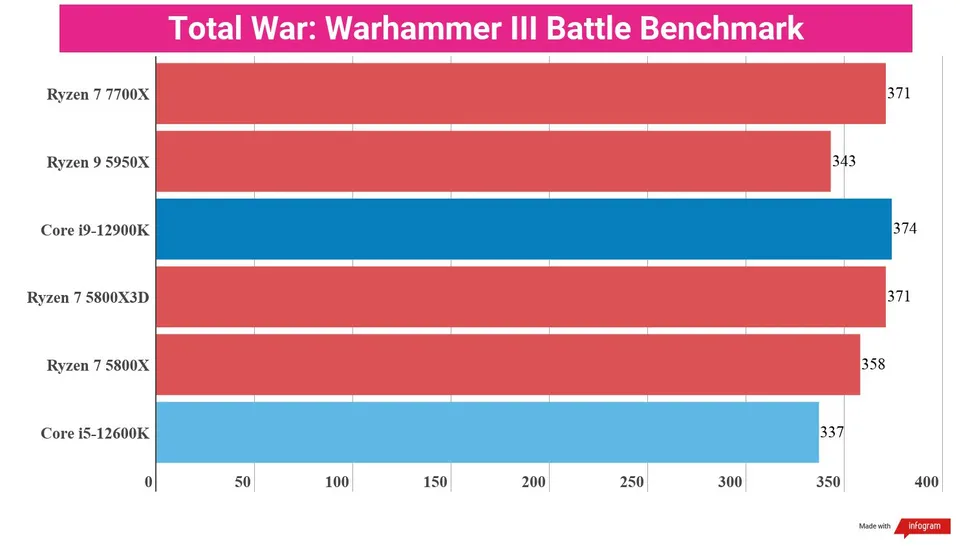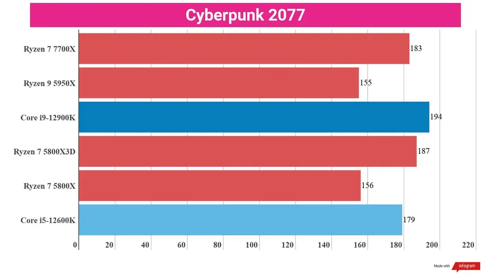 Ryzen 7 7700X не уступает Ryzen 7 5800X3D, у которого значительно больше кэш-памяти третьего уровня, что существенно повышает производительность процессора в играх. Какой из них окажется лучшим по частоте кадров в секунду, зависит от игры, но в среднем Ryzen 7 7700X превосходит все остальные чипы, которые мы тестировали. Core i9-12900K одержал победу в Cyberpunk 2077 и Total War: Warhammer III, но даже в этих играх разница была незначительной.