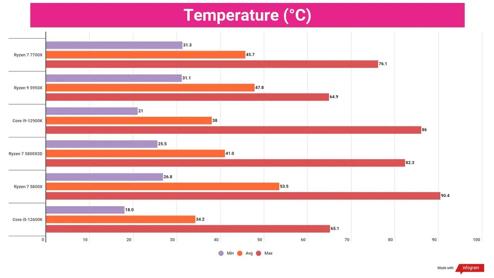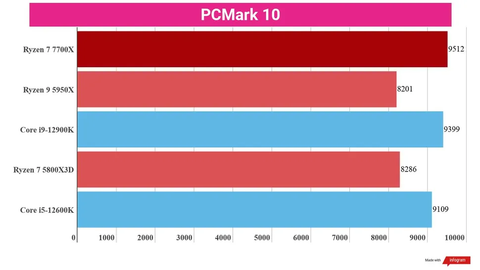 В синтетических тестах одноядерная производительность Ryzen 7 7700X в среднем немного выше, чем у Core i9-12900K, и в среднем на 27 % выше, чем у Ryzen 7 5800X, а многоядерная производительность выше на 33 %. С точки зрения общей вычислительной производительности, измеренной с помощью PCMark 10, он превосходит Core i9-12900K (9512 против 9399) и уверенно опережает Ryzen 7 5800X (9512 против 8305), обеспечивая в среднем на 14 % более высокую производительность.