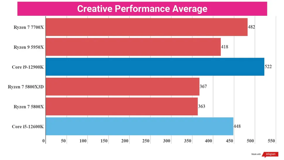 Интересно, что общая производительность Ryzen 7 7700X на 15,12 % ниже, чем у Core i9-12900K, но это компенсирует 32,25 % общего отставания Ryzen 7 5800X от того же чипа.