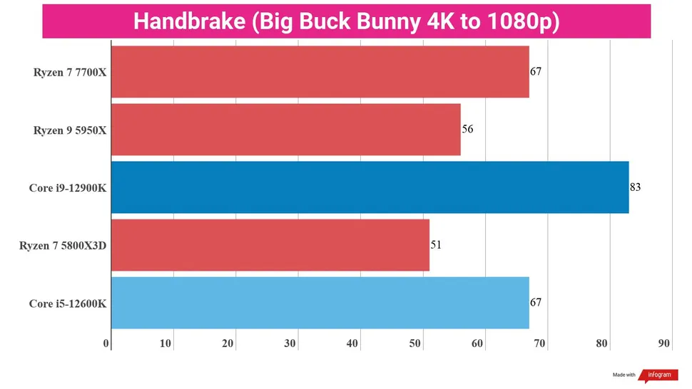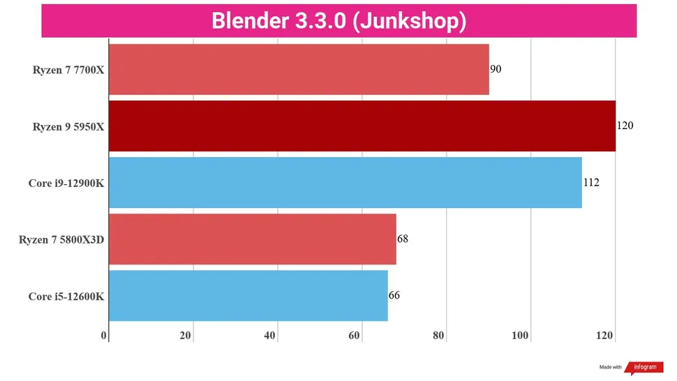 Когда дело доходит до создания контента, многоядерная производительность действительно играет ключевую роль, и это, пожалуй, самая «слабая» сторона Ryzen 7 7700X. Когда дело доходит до редактирования и кодирования видео, а также 3D-рендеринга, Core i9-12900K практически одерживает победу в каждом тесте, занимая второе место после Ryzen 9 5950X в тесте рендеринга Junkshop в Blender 3.3.0 (112 и 120 баллов соответственно). Ryzen 7 7700X занимает почётное третье место с результатом 90 баллов, однако он значительно опережает Ryzen 7 5800X3D (68 баллов) и Core i5-12600K (66 баллов).
