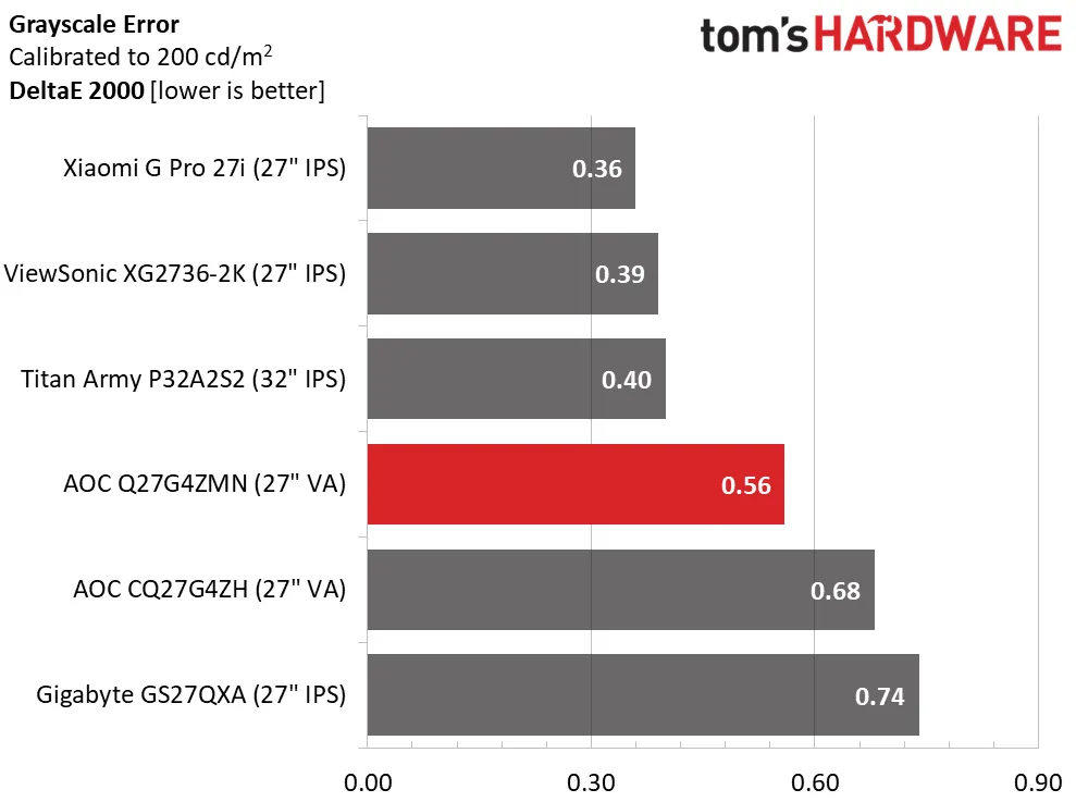 Я нечасто встречаю мониторы, у которых ошибка градаций серого составляет всего 0,93dE прямо из коробки, но Q27G4ZMN — один из таких редких экранов. Следующие два конкурента тоже хороши без калибровки. После внесения корректировок все мониторы показывают ошибку менее 1dE, а у Q27G4ZMN — 0,56dE, что очень впечатляет.
