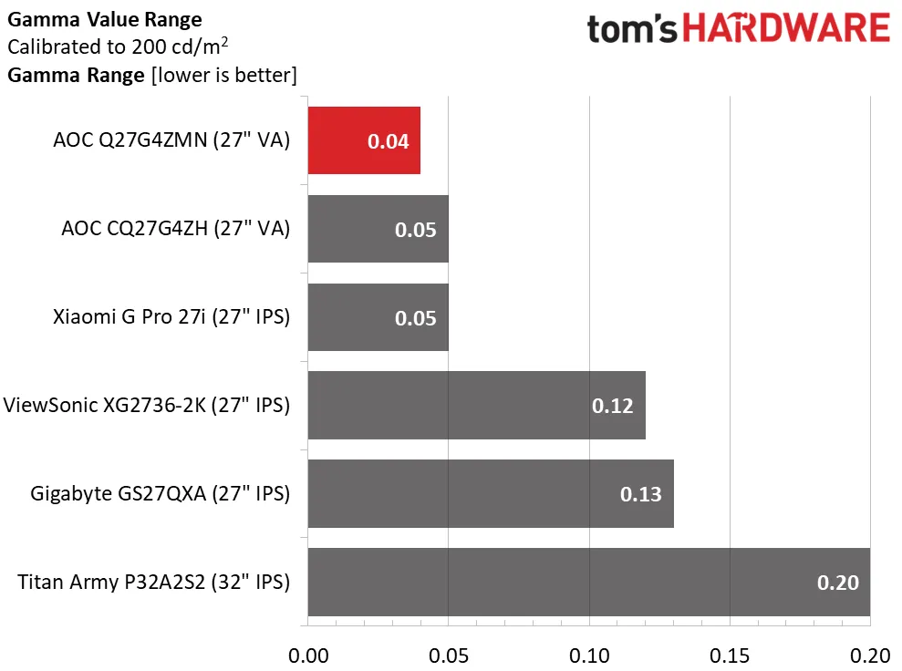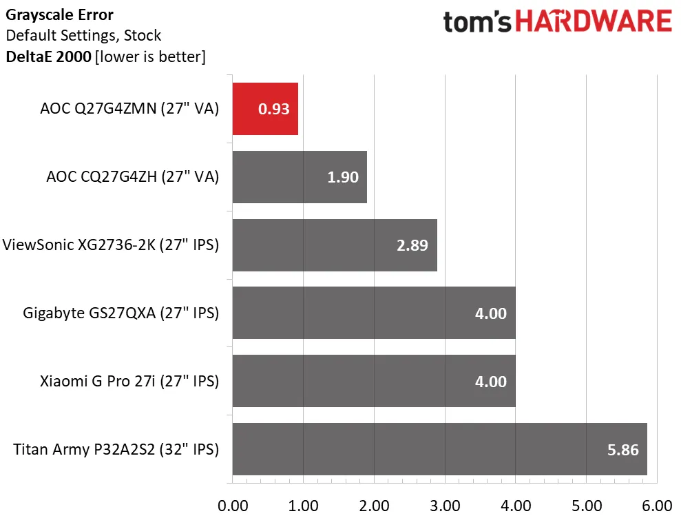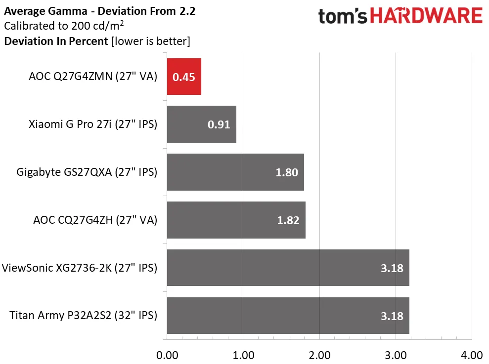 Калибровка не сильно меняет расстановку сил. Два монитора AOC по-прежнему значительно опережают конкурентов. Хотя коэффициент контрастности Q27G4ZMN составляет чуть менее 5000:1 против 5482:1 у CQ27G4ZH, визуальная разница невелика. Только OLED-монитор будет выглядеть существенно иначе, чем эти превосходные VA-панели.