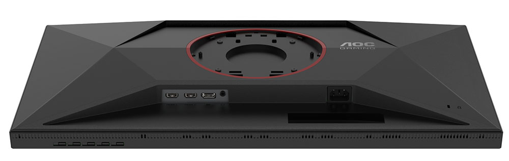 AOC сохраняет стиль Q27G4ZMN сдержанным, но есть несколько красных элементов, указывающих на его игровую направленность. Вы можете видеть, что смещенное отверстие для кабелей имеет красную окантовку, а вокруг точки крепления сзади есть красное кольцо. Единственная другая графика — это надпись «AOC» спереди и «AOC Gaming», напечатанная сзади. Форма создается плоскими треугольниками, которые пересекаются в верхней части, образуя небольшую вентиляционную решетку.