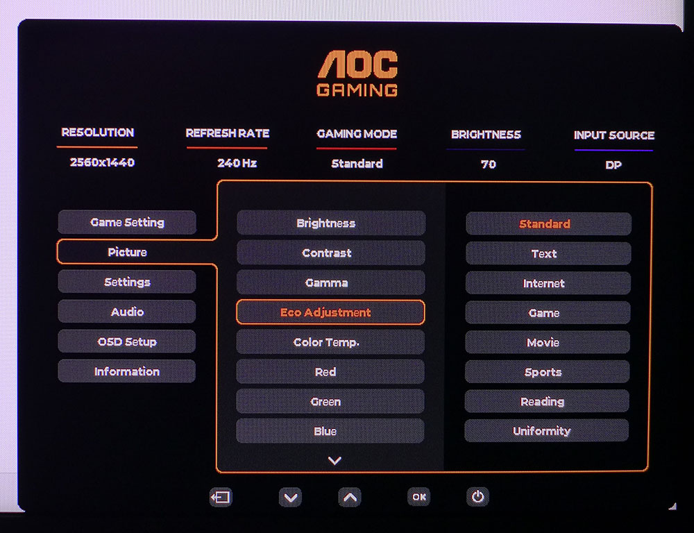 В меню изображения есть дополнительные режимы, называемые Eco Adjustment. Я рекомендую оставить и здесь значение «Standard», чтобы избежать путаницы. Большое количество игровых и эко-режимов создает буквально десятки возможных комбинаций. Лучше придерживаться «Standard» и настраивать отталкиваясь от него.