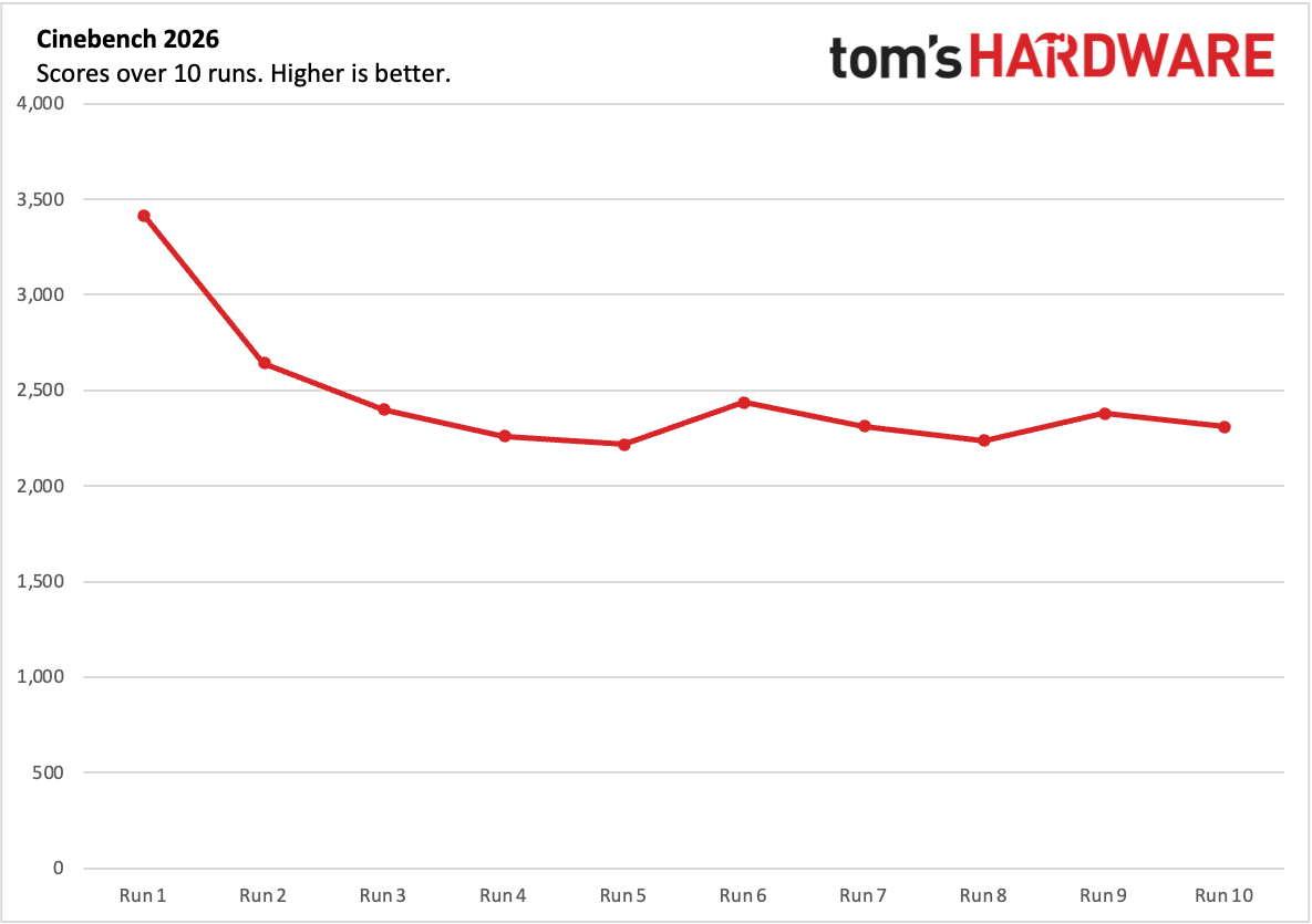 Вполне ожидаемо, что без вентилятора M5 со временем начинает сбрасывать частоты из-за нагрева. В стресс-тесте Cinebench 2026 процессор стартовал с бодрых 3415 баллов, но в ходе последующих прогонов результаты постепенно снижались, пока не стабилизировались на отметке около 2300 баллов. Apple традиционно не даёт сторонним утилитам вроде TG Pro считывать точные тактовые частоты, но по оценкам Cinebench, внутри этого ноутбука M5 работает на частоте 4,3 ГГц в однопотоке и 3,6 ГГц при нагрузке на все ядра.