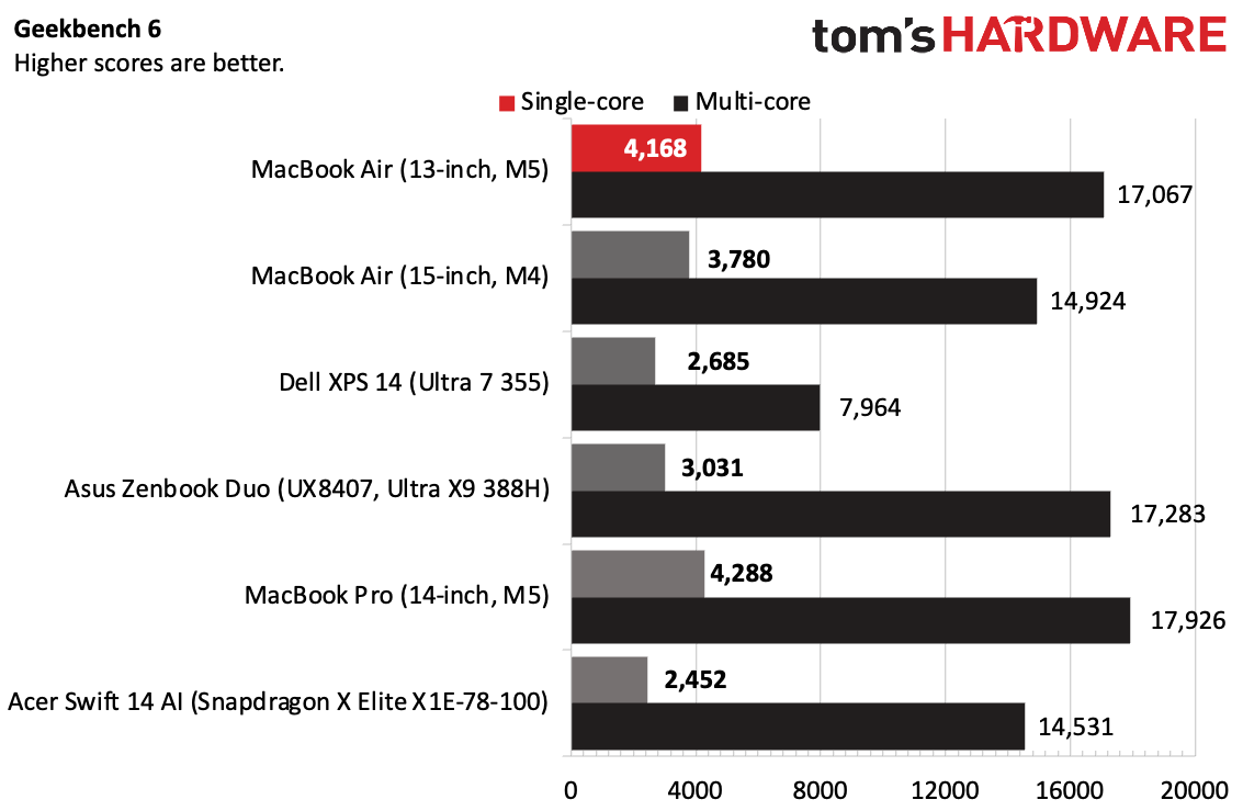В бенчмарке Geekbench 6 наш Air выбил 4168 баллов в одноядерном и 17067 в многоядерном тесте. Для сравнения, MacBook Pro с вентилятором выжал чуть больше: 4288 и 17926 баллов соответственно. Процессор Intel Core Ultra X9 388H обошел M5 в многопотоке (17283 балла), но давайте будем честны — ноутбук от Asus стоит почти в два раза дороже Air, так что разрыв невелик. Прошлогодний чип Apple M4 закономерно уступил новинке, но его результат на одно ядро всё ещё обходит процессоры от Intel.