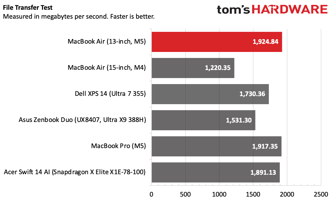 В тесте на копирование 25 ГБ файлов Air показал скорость 1924,84 МБ/с. Он чуть обогнал MacBook Pro на M5 и оставил позади обе Windows-машины на Intel.