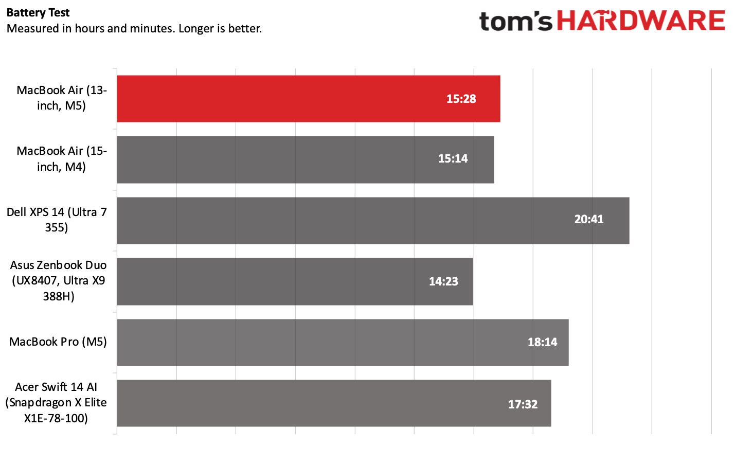 И хотя это шикарный показатель, которого с головой хватит на весь рабочий день, некоторые конкуренты живут ещё дольше. MacBook Pro на M5 с батареей на 72,4 Вт·ч проработал 18 часов 14 минут. Dell XPS 14 выдал аж 20 часов 41 минуту (правда, с экраном меньшего разрешения). ARM-конкурент в лице Swift 14 на базе Snapdragon X Elite тоже обошел мак, показав результат в 17 часов 32 минуты.