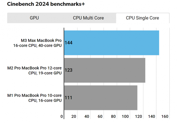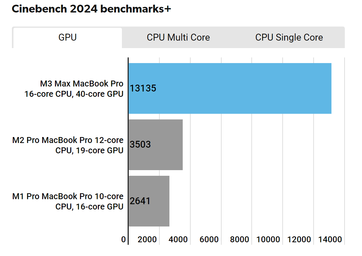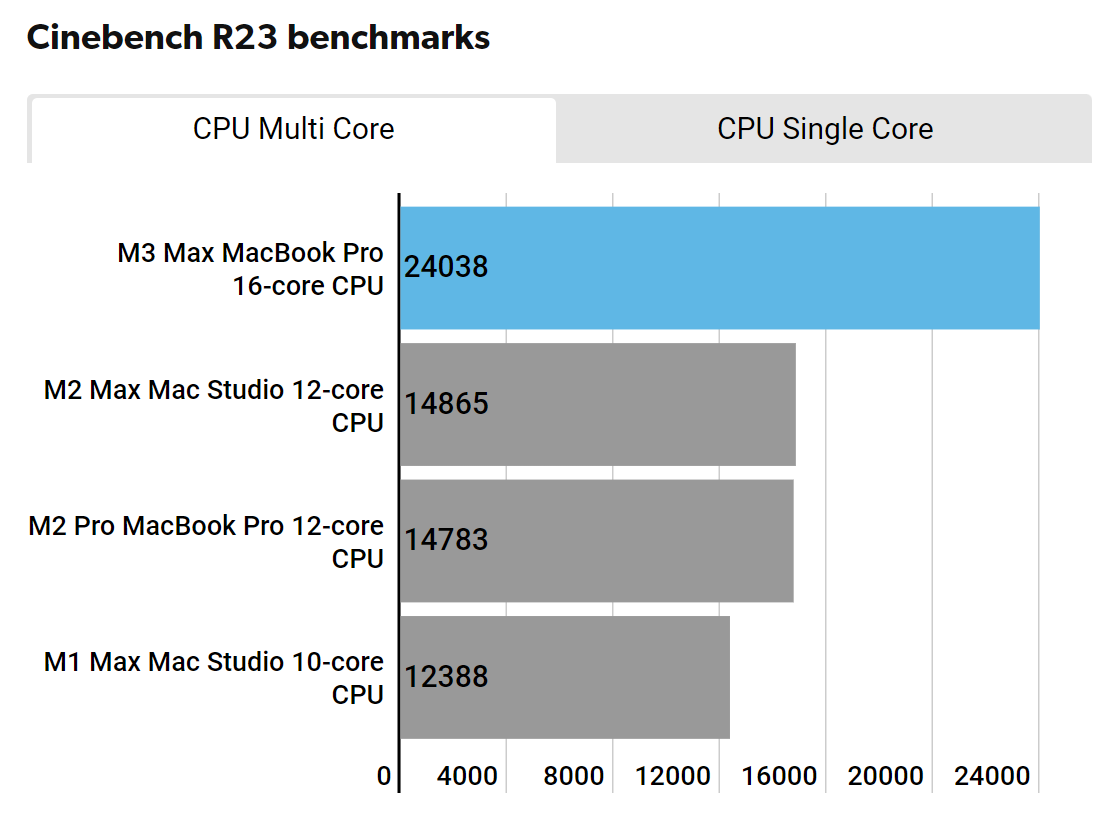 В более старом бенчмарке Cinebench R23 выделяется производительность CPU, а не GPU. Здесь мы видим впечатляющий 62-процентный прирост M3 Max у MacBook Pro по сравнению с M2 Max в Mac Studio. Здесь видно преимущество большего количества производительных ядер CPU.