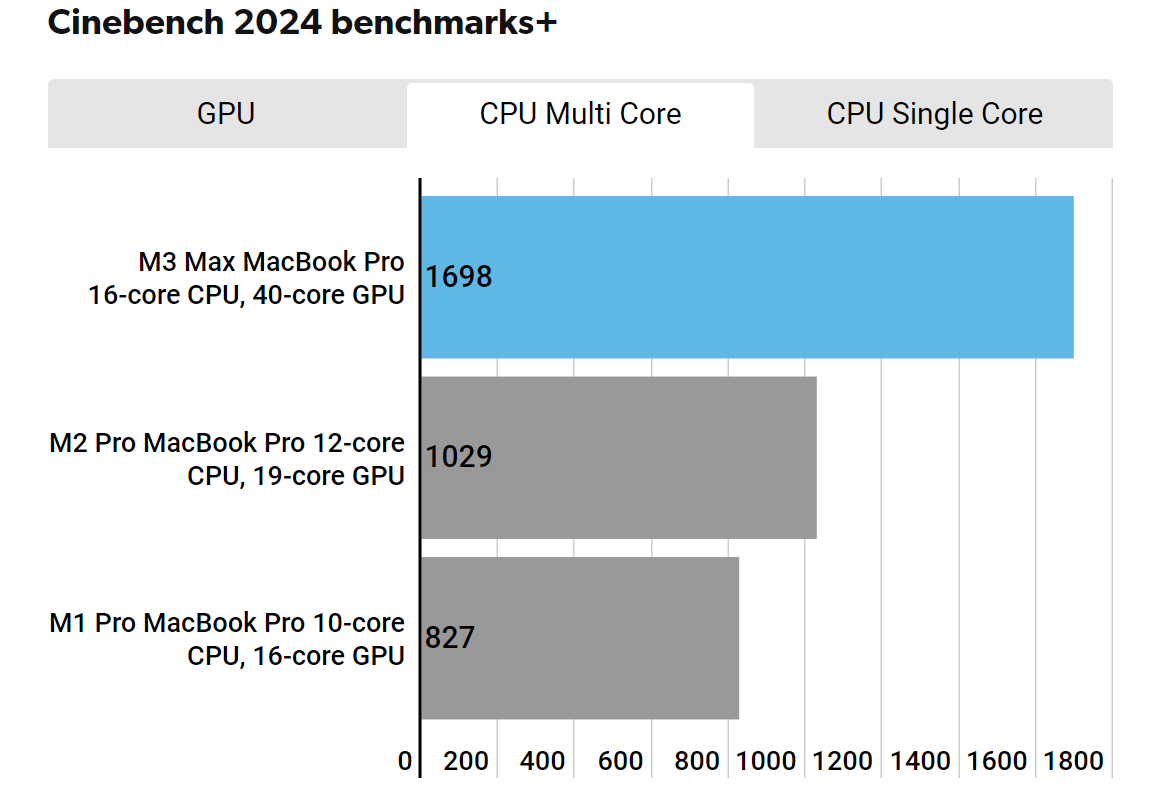 Ноутбук на базе процессора Intel в диаграмме — это самый быстрый (и последний) Core i9 MacBook Pro от Apple, выпущенный в 2019 году. Его полностью обходит MacBook Pro M3 Max. Если вы до сих пор используете этот или более старый ноутбук Intel, представьте, насколько производительнее вы сможете стать, если обновите его.