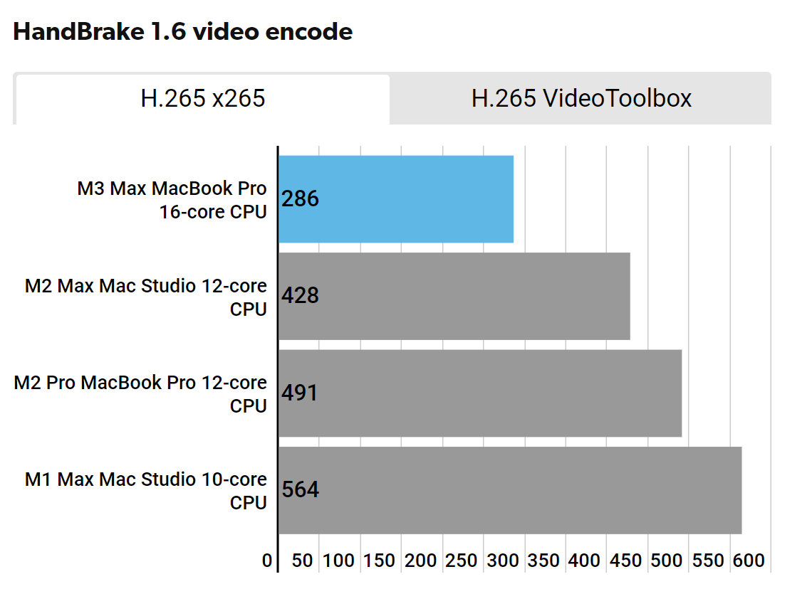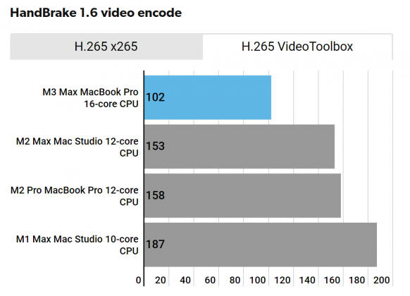 Мы использовали HandBrake для кодирования видеоролика Tears of Steel из формата 4K в файл H.265 1080p. При программном кодировании с использованием кодировщика H.265 (x265) M3 Max показал значительный прирост скорости на 33% по сравнению с M2 Max. При использовании кодировщика H.265 (VideoToolBox) HandBrake программа использует доступное аппаратное ускорение, поэтому здесь M3 Max показал 33-процентное улучшение.