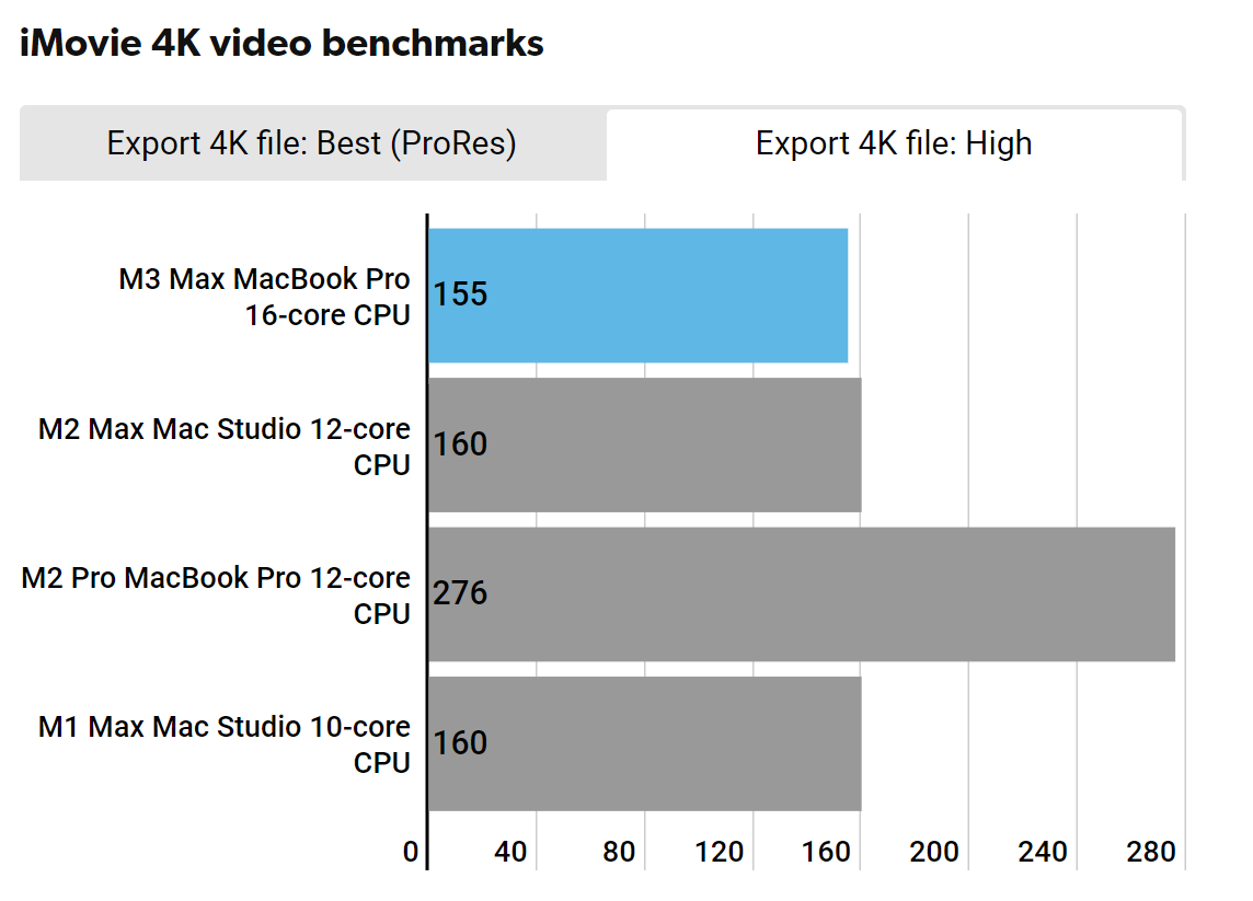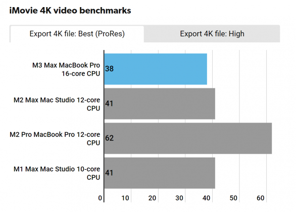 В бенчмарке iMovie 4K мы экспортировали 10-минутный 4K-видеоролик при двух настройках. Наше тестирование показало, что MacBook Pro M3 Max имеет очень небольшое преимущество перед M2 Max в Mac Studio. В этом тесте используются видеокодеры на чипах, но уязвимым местом является SSD-накопитель, что и объясняет схожесть результатов.