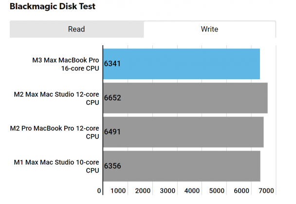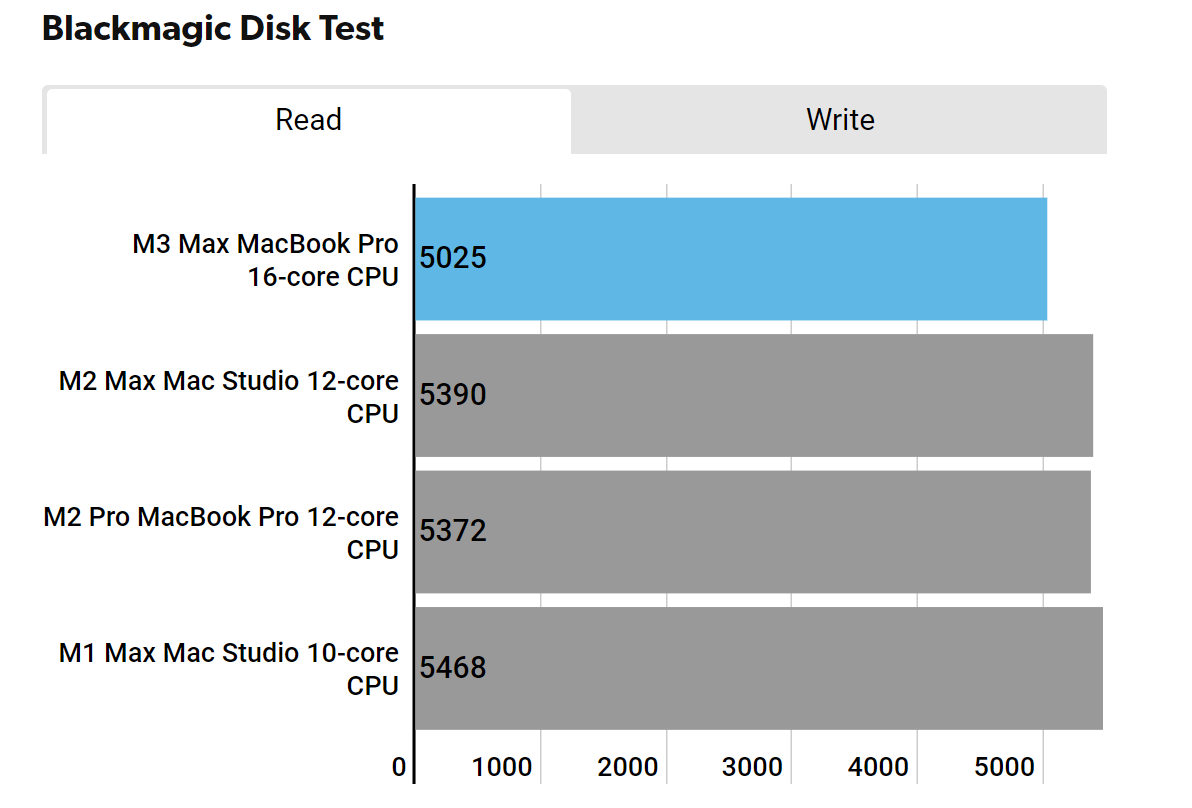 Скорости записи между новыми и старыми чипами Max относительно одинаковы, но скорость чтения нашего MacBook Pro оказалась примерно на 10% ниже, чем у остальных, даже при тестировании в режиме High Power Mode. Это любопытный результат, но в реальной жизни вы, скорее всего, не заметите разницы, если только не будете работать с гигантскими файлами.
