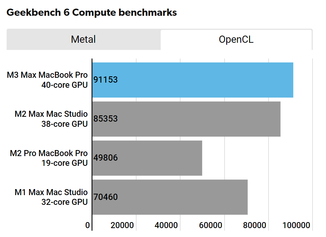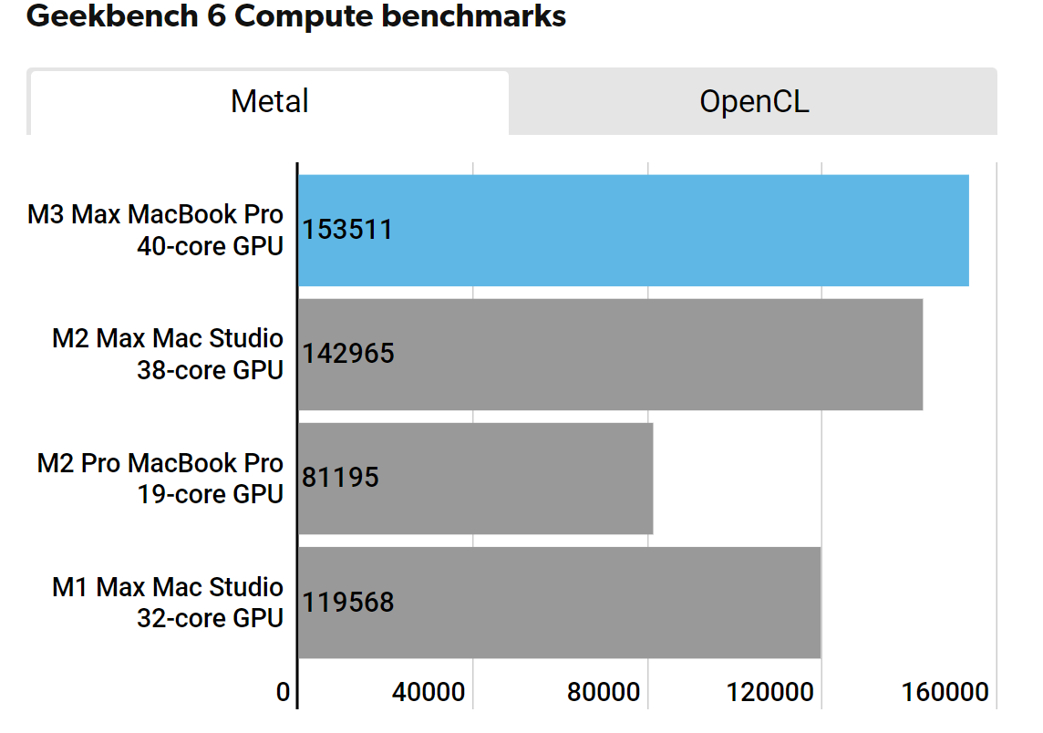 Бенчмарк Compute в Geekbench проверяет производительность GPU с использованием API Metal или OpenCL. В обоих тестах M3 Max с 40-ядерным GPU оказался на 7% быстрее, чем M2 Max с 38-ядерным GPU. Более существенный прирост наблюдается между M3 Max и 32-ядерным GPU M1 Max, где M3 Max был на 29% быстрее как с Metal, так и с OpenCL.