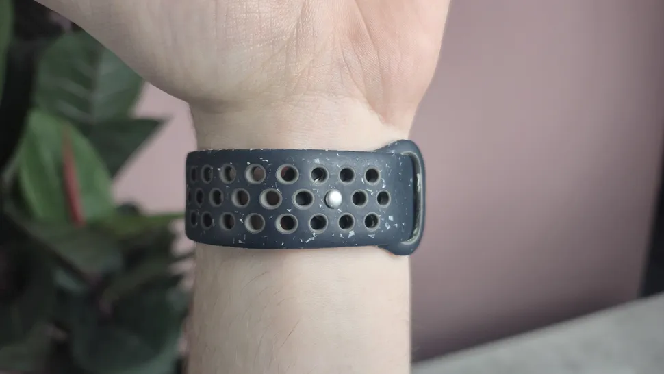 В частности, Apple Nike Sport Band изготовлен из водонепроницаемого и устойчивого к поту материала — фторэластомера. Apple утверждает, что каждый ремешок на 30% состоит из переработанного фторэластомера, а чешуйки, разбросанные по ремешку, на 66% состоят из фторэластомера — довольно аккуратно. Интересно, что эти чешуйки разбросаны случайным образом, благодаря чему каждый ремешок Nike Sport Band уникален.