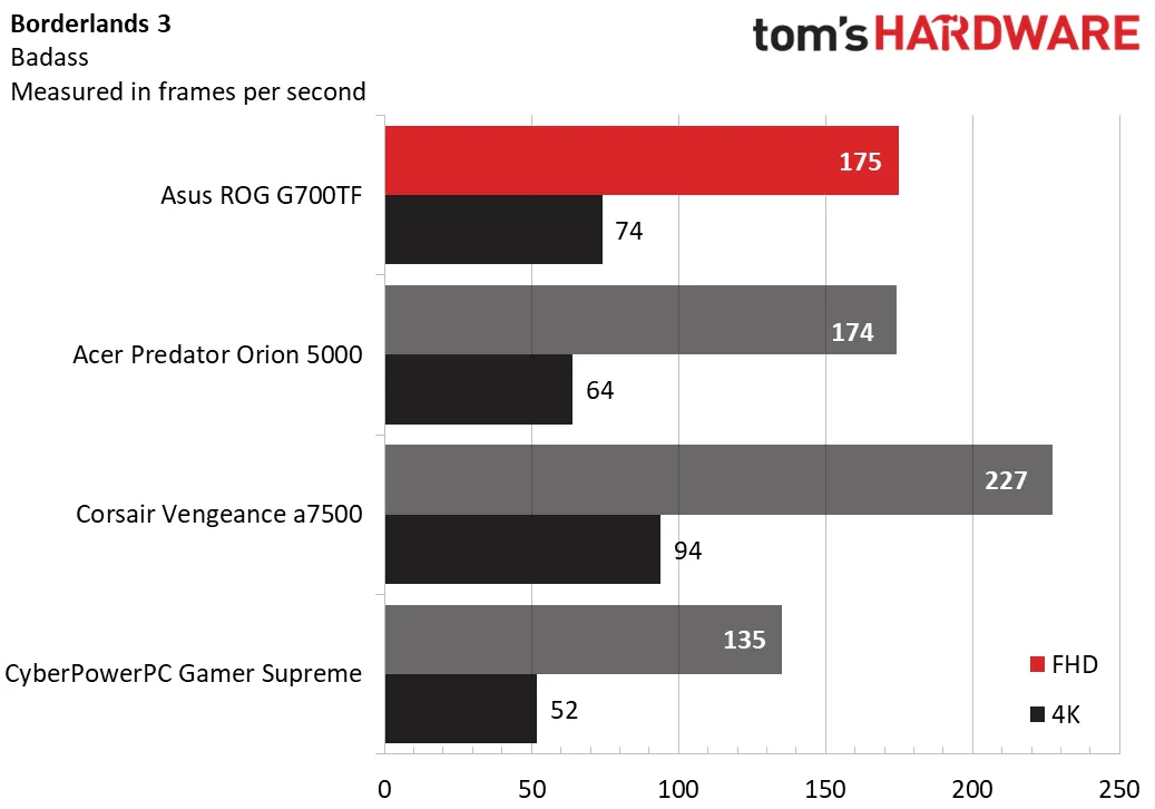 Наконец, в Borderlands 3 на настройках «Badass» G700 и Acer показали практически одинаковые результаты при разрешении 1080p: 175 и 174 кадра в секунду соответственно. G700 вырвался вперёд при разрешении 4K, выдав 74 кадра в секунду по сравнению с 64 кадрами в секунду у Acer. У CyberPower частота кадров составила 135 FPS (1080p) и 52 FPS (4K), в то время как Corsair снова оказалась лидером с показателями 227 FPS и 94 FPS.