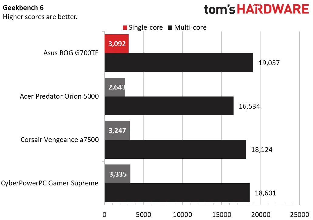 Наша обзорная модель ROG G700 оснащена процессором Intel Core Ultra 7 265KF, видеокартой GeForce RTX 5070 и 32 ГБ оперативной памяти. Он находится в середине нашей линейки для сравнения и стоит дороже, чем CyberPowerPC Gamer Supreme (Ryzen 7 9800X3D, RTX 5060 Ti, протестировано за 1859,99 долларов США/150 тыс. руб.), но намного дешевле, чем Corsair Vengeance a7500 (Ryzen 7 9800X3D, RTX 5070 Ti, протестировано за 2799,99 долларов США/226 тыс. руб.). Мы также включили в список Acer Predator Orion 5000 (Core i7-14700F, RTX 4070 Super, протестирован за 1499,99 долларов США/121 тыс. руб.) с процессором предыдущего поколения, но всё ещё мощным.