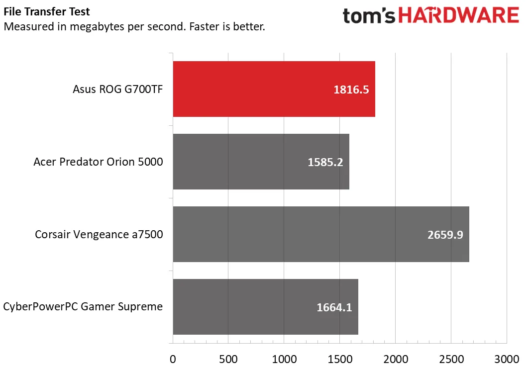 В нашем тесте на передачу файлов размером 25 ГБ с использованием основного накопителя G700TF показал результат выше среднего — 1816,5 МБ/с. Он обошёл Acer (1585,2 МБ/с) и CyberPower (1664,1 МБ/с), но не смог сравняться с Corsair, который показал результат 2659,9 МБ/с.