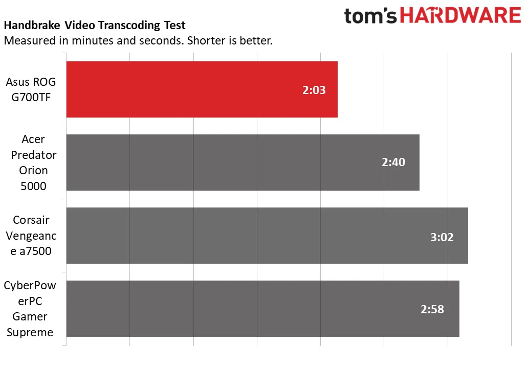 В нашем тесте Handbrake процессор Core Ultra 7 265KF в ноутбуке G700 справился с перекодированием видео с разрешением 4K в 1080p всего за 2 минуты 3 секунды. Acer показал результат 2:40, а Corsair (3:02) и CyberPower (2:58) финишировали последними.