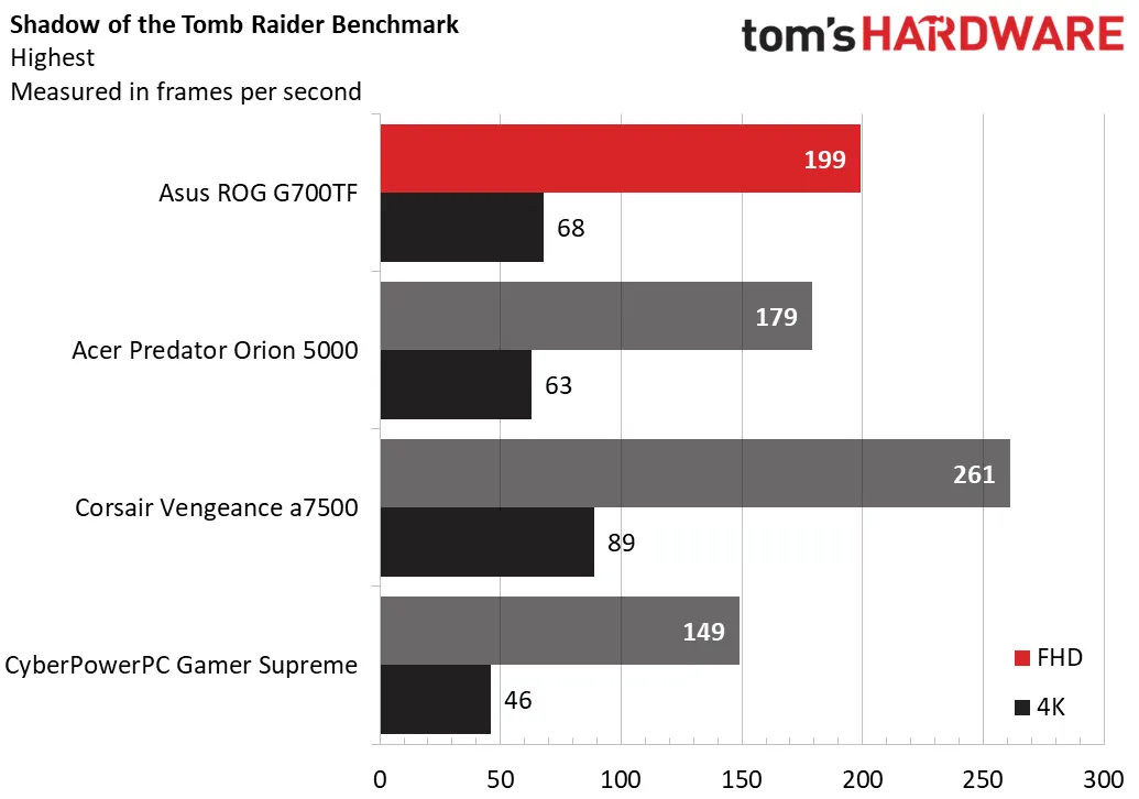 В Shadow of the Tomb Raider (с максимальными настройками детализации) G700 выдавал 199 кадров в секунду при разрешении 1080p и 68 кадров в секунду при разрешении 4K, занимая промежуточное положение между CyberPower на базе RTX 5060 Ti (149 кадров в секунду при разрешении 1080p, 46 кадров в секунду при разрешении 4K) и RTX 5070 Ti Corsair (261 кадр в секунду и 89 кадров в секунду соответственно). Acer почти не отставал, несмотря на использование более старой видеокарты RTX 4070 Super: 179 кадров в секунду при разрешении 1080p и 63 кадра в секунду при разрешении 4K.
