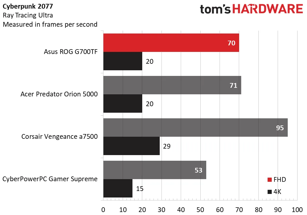 В Cyberpunk 2077 (с предустановкой Ray Tracing Ultra) G700 показал себя наравне с Acer: 70 кадров в секунду при разрешении 1080p и 20 кадров в секунду при разрешении 4K. CyberPower отставал (53 кадра в секунду при разрешении 1080p, 15 кадров в секунду при разрешении 4K), в то время как Corsair доминировал (95 кадров в секунду и 29 кадров в секунду).