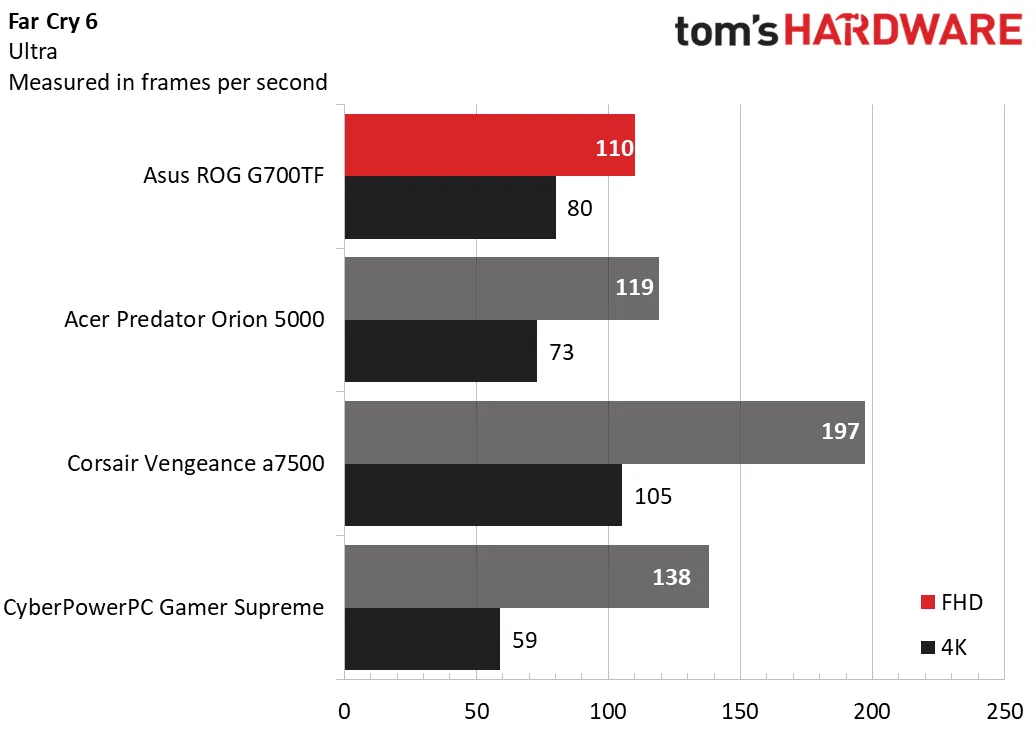 В Far Cry 6 на настройках «Ультра» G700 выдавал 110 кадров в секунду при разрешении 1080p и 80 кадров в секунду при разрешении 4K, неожиданно уступив CyberPower при разрешении 1080p (138 кадров в секунду), но опередив его при разрешении 4K (59 кадров в секунду). Acer снова показал хорошие результаты: 179 кадров в секунду при разрешении 1080p и 63 кадра в секунду при разрешении 4K, в то время как Corsair остался явным лидером с показателями 197 кадров в секунду и 105 кадров в секунду соответственно.