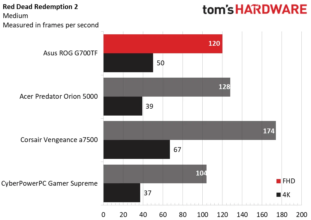 При переходе к Red Dead Redemption 2 на настройках «Средние» G700 выдавал стабильные 120 кадров в секунду при разрешении 1080p и 50 кадров в секунду при разрешении 4K. Этот результат в 4K превзошёл показатели Acer (39 кадров в секунду) и CyberPower (37 кадров в секунду), но не смог сравниться с выдающимися показателями Corsair (67 кадров в секунду).