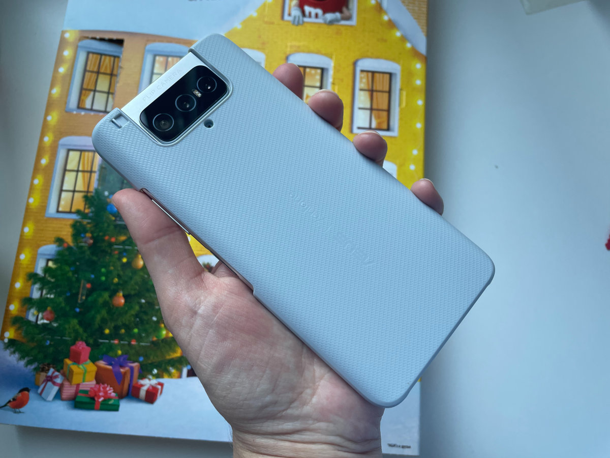 И стекло, и алюминий корпуса стойки к появлению царапин и хорошо противостоят отпечаткам пальцев. Справедливости ради замечу, что в белом корпусе они в любом случае не так заметны, как в черном. Как положено порядочному стеклянному смартфону, ASUS ZenFone 7 Pro так и норовит соскользнуть с любой наклонной поверхности, хотя в руке его держишь уверенно. К смартфону полагается сразу два чехла, обычный силиконовый и пластиковый, со специальной защелкой, чтобы фиксировать камеру.