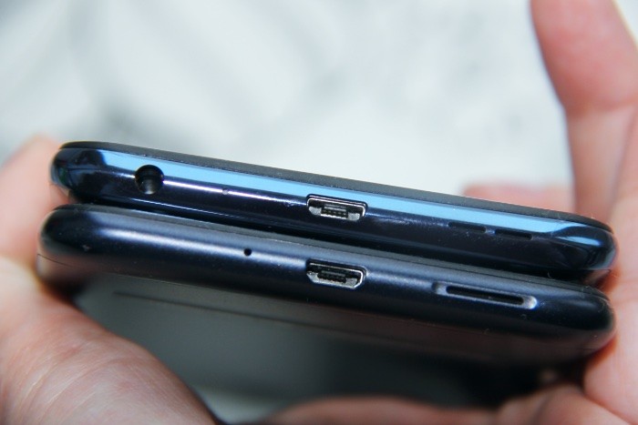 Дальше начинаются различия: в Zenfone Max Pro M2 слева от Micro USB вырез под миниджек для наушников и маленькая дырочка под микрофон. Правее – двойной вырез под динамик.