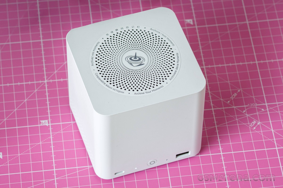 У него интересный дизайн: логотип Beelink в верхней части, окружённый вентиляционным отверстием с точечным узором, а сбоку надпись «Архивируйте свои моменты» на шести разных языках. В нижней части есть шесть резиновых ножек, а также вентиляционные отверстия слева и справа от ПК.