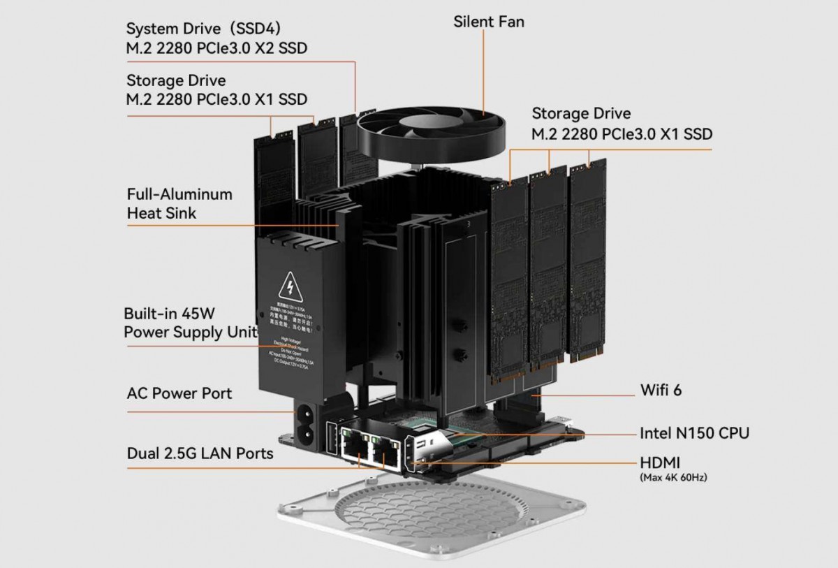 ME mini поддерживает до 4 ТБ SSD-накопителей на каждый диск, что в общей сложности составляет 24 ТБ данных. Вы можете выбрать между SSD-накопителями типа M.2 2230/2242/2280. Процессор Intel N150 основан на архитектуре Intel Twin Lake, которая является скорее модификацией старого Alder Lake, чем новой разработкой. Он основан на 7-нм техпроцессе Intel, то есть это 10-нм процессор.