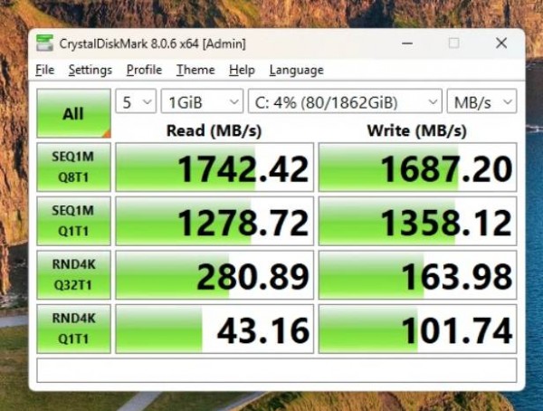 Однако, поскольку в комплект поставки EQ14 входил SSD-накопитель SATA III, ME mini с PCIe 3.0 Crucial P3 Plus обошёл его — в Passmark он на 70% лучше. И действительно, в то время как накопитель на 512 ГБ в EQ14 обеспечивает скорость чтения около 530 МБ/с и скорость записи около 525 МБ/с, накопитель Crucial P3 Plus в ME mini обеспечивает скорость 1740 МБ/с и 1687 МБ/с соответственно.