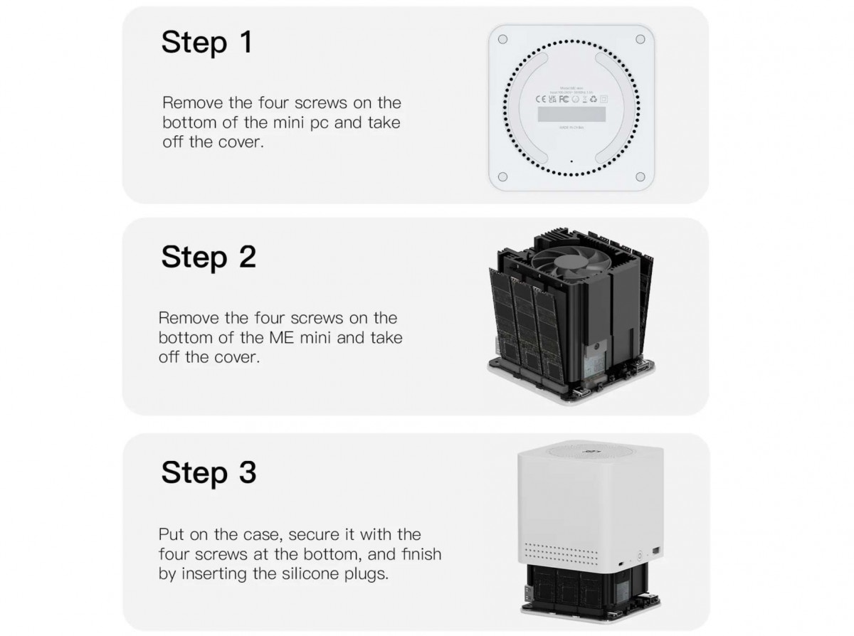 Чтобы открыть Beelink ME Mini и получить доступ к шести слотам M.2 для твердотельных накопителей, сначала нужно снять четыре резиновые ножки и нижнюю панель, а затем открутить четыре винта. Затем поднимите пластиковую внешнюю крышку вверх, и вы получите доступ.