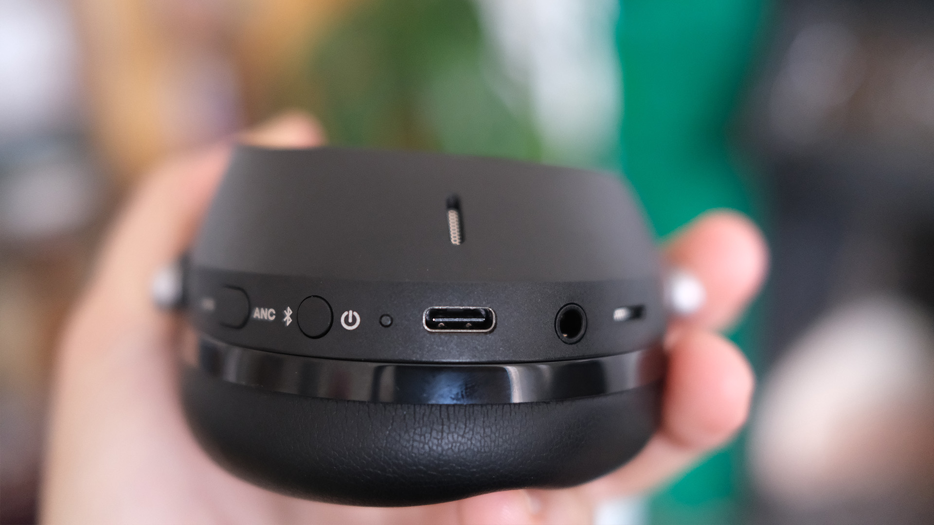 На левой чашке наушников Beyerdynamic Aventho 300 нет никаких элементов управления — все они расположены справа. Здесь находится кнопка для переключения между режимом прозрачности и шумоподавлением, а также кнопка питания, которая также активирует сопряжение по Bluetooth. Кроме того, есть порт USB-C для зарядки и разъем для наушников. Это означает, что физических кнопок для регулировки громкости или управления воспроизведением нет — все это делается с помощью сенсорного управления.