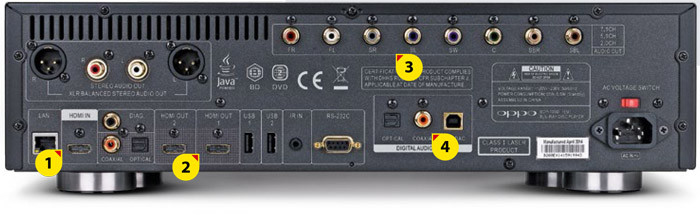 Помимо небалансных и балансных XLR здесь имеется многоканальный аудиовыход для подключения к старым ресиверам, не оснащенным HDMI-входами или не поддерживающим сигнал с SACD или DVD-Audio.