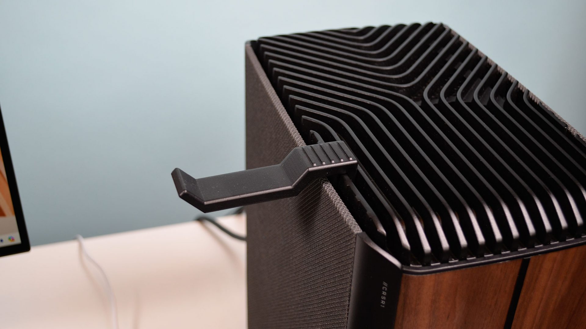 В зависимости от цвета корпуса вы получаете разную деревянную панель (орех для черного корпуса и сосна для серебристого), и обе версии стоят одинаково, так что доплачивать за выбор не придется. В комплекте с ПК также идет крепление для наушников, которое можно установить с любой стороны, и портов более чем достаточно для любой периферии.