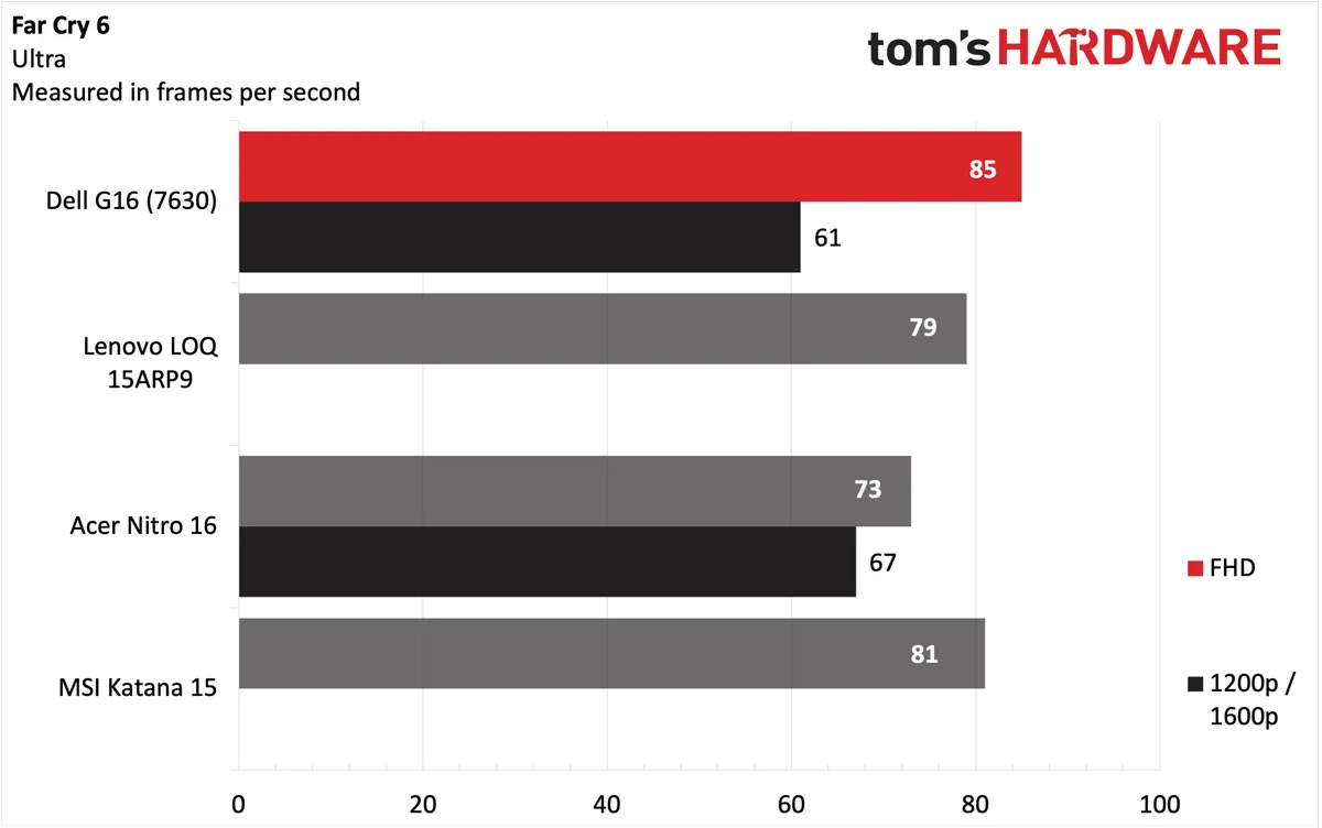 Far Cry 6 (настройки «Ультра») снова показала, что G16 лидирует при разрешении 1080p с частотой 85 кадров в секунду, опережая Katana 15 на 4 кадра в секунду и LOQ на 6 кадров в секунду. При разрешении 1600p производительность снизилась не так сильно, как в двух предыдущих играх: мы зафиксировали 61 кадр в секунду.