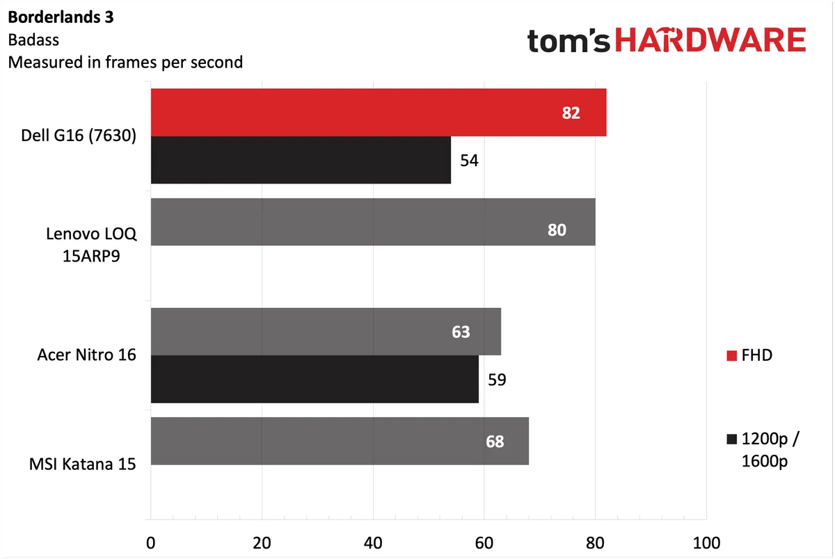 Наконец, Borderlands 3 (с настройками Badass) вернул G16 на привычное место в верхней части рейтинга с частотой 82 кадра в секунду при разрешении 1080p. Это позволило ему опередить LOQ и значительно оторваться от Nitro 16 (63 кадра в секунду) и Katana 15 (68 кадров в секунду). При исходном разрешении (1600p) G16 показал 54 кадра в секунду.