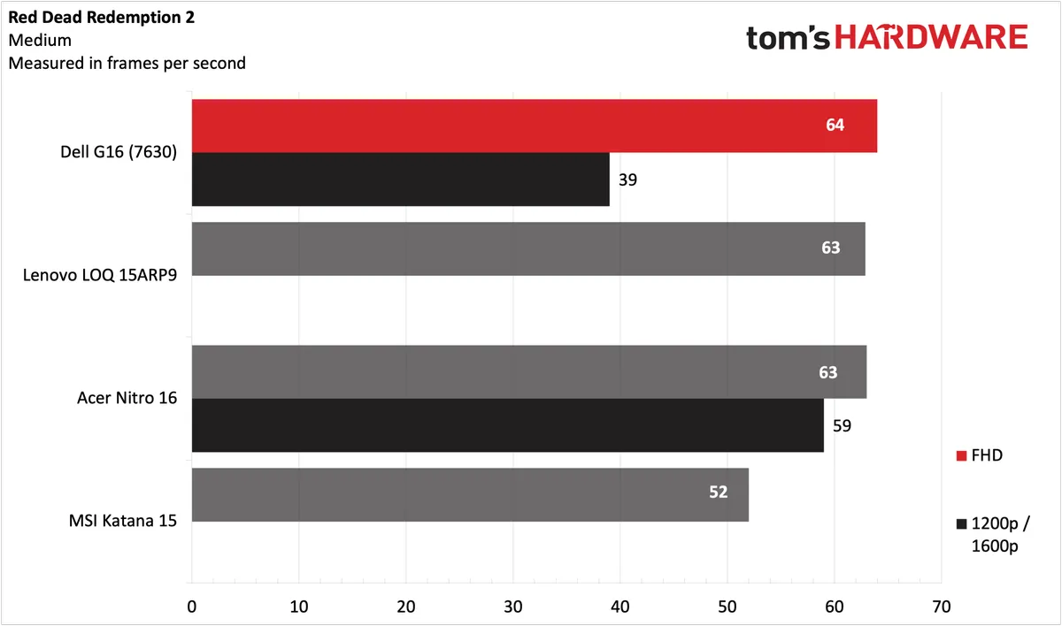Мы увидели плотную группу претендентов на первое место в Red Dead Redemption 2 (средние настройки), и G16 одержал победу в разрешении 1080p, опередив LOQ и Nitro 16 всего на 1 кадр. В разрешении 1600p производительность G16 упала до 39 кадров в секунду.