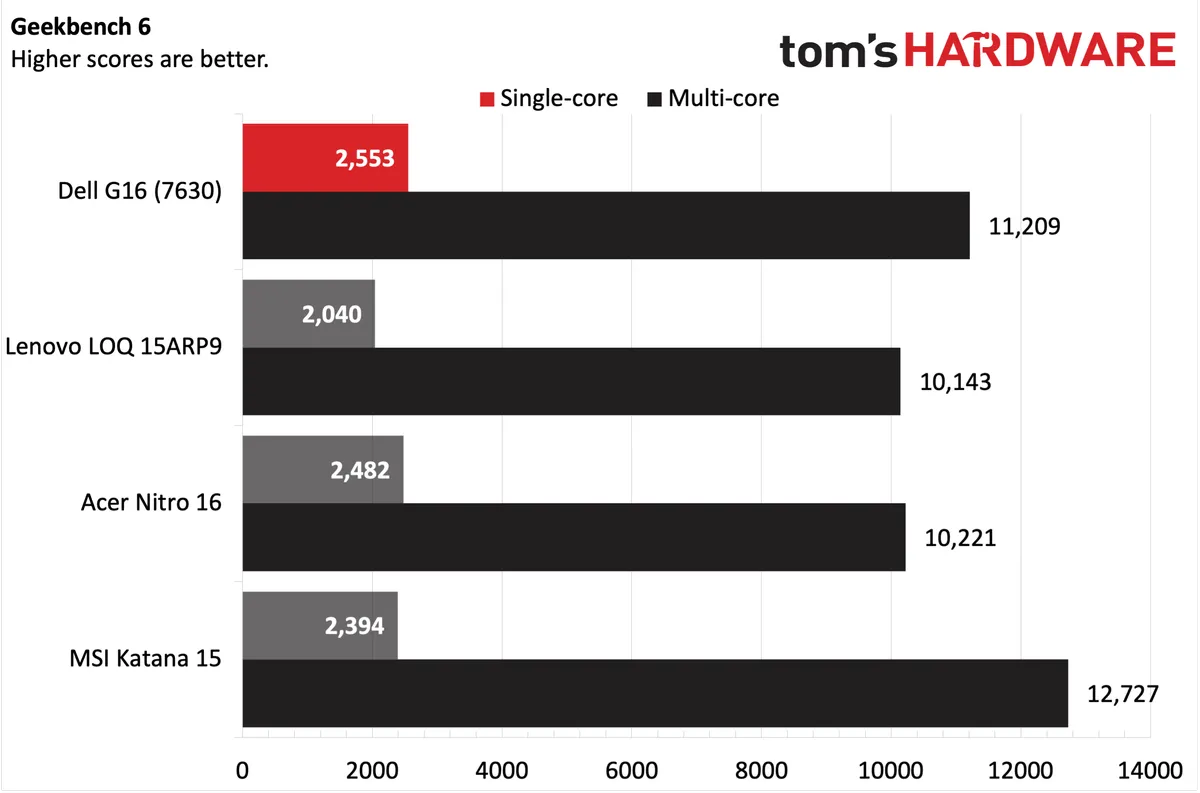 В синтетическом тесте процессора Geekbench 6 G16 разделил первое место с Katana 15. G16 занял первое место в одноядерном тесте (2553 против 2394), но Katana 15 одержала победу в многоядерном тесте (12 727 против 11 209).