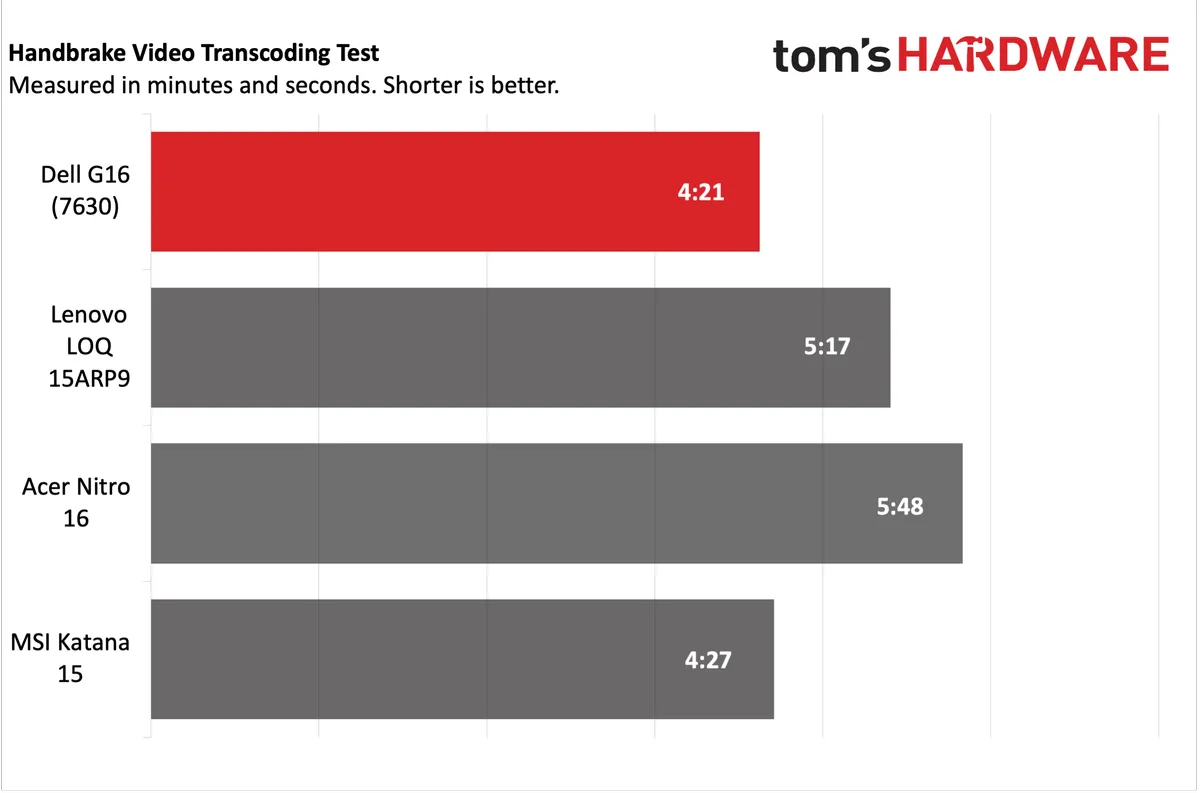 Наш тест Handbrake, в ходе которого мы перекодировали видеофайл в формате 4K в формат 1080p, также показал высокие результаты G16. Он справился с задачей за 4 минуты 21 секунду, опередив занявшую второе место Katana 15 на 6 секунд. Nitro 16 оказался самым медленным в группе: на выполнение задачи у него ушло 5 минут 48 секунд.