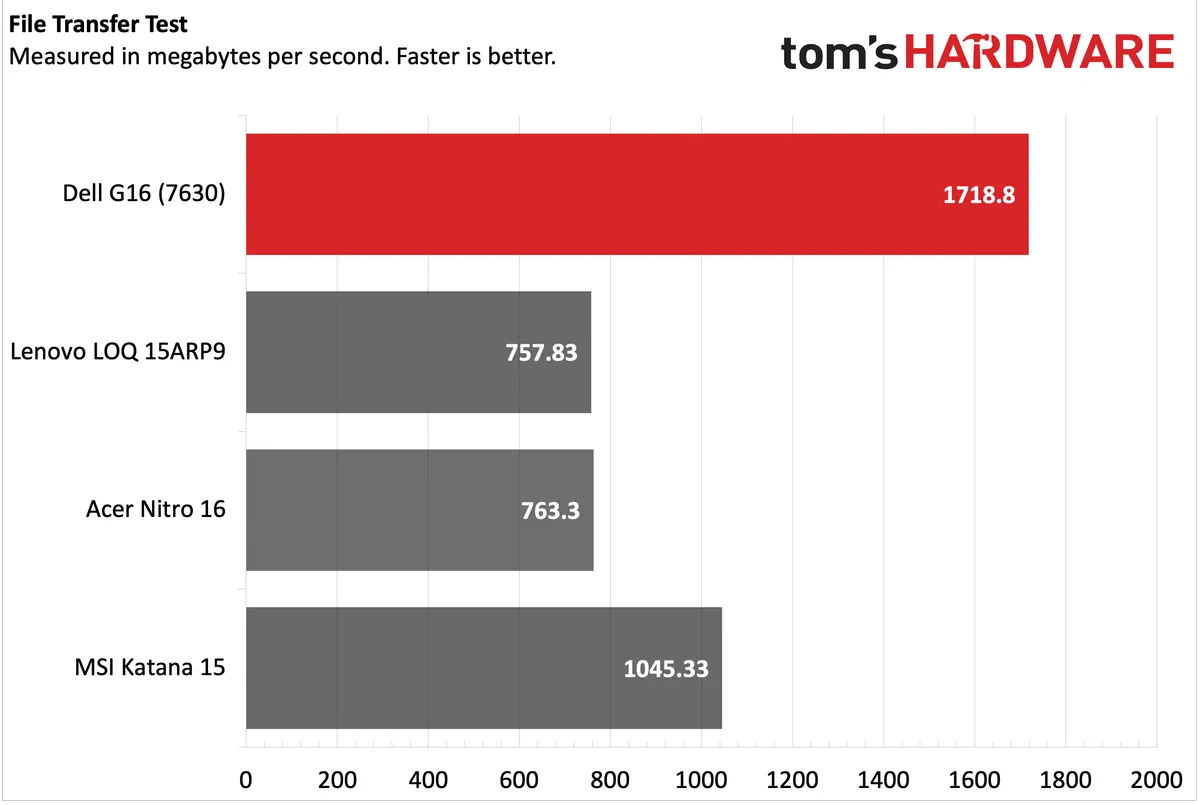 Переходя к тесту на передачу файлов, который предполагает копирование 25 ГБ смешанных файлов на SSD, отметим, что G16 значительно опередил конкурентов, показав скорость 1718,8 Мбит/с. Следующим по скорости был Katana 15 с показателем 1045,33 Мбит/с.