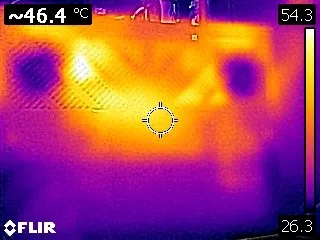 Во время запуска теста Metro Exodus мы измерили температуру между клавишами G и H на клавиатуре — 35,8 °C (96,5 °F), в то время как тачпад был относительно холодным — 25,2 °C (77,5 °F). Нижняя часть корпуса в среднем нагревалась до 38 °C (100,5 °F), но самая горячая часть ноутбука находилась ближе к задней части корпуса — 41,7 °C (107 °F).