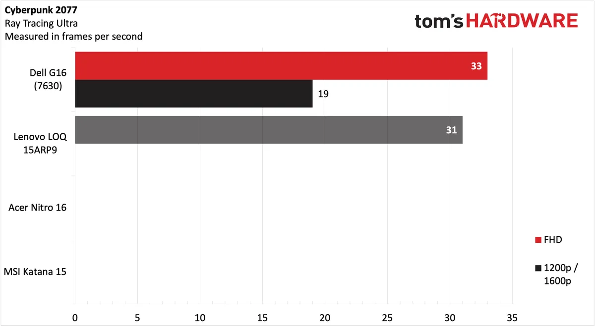 Cyberpunk 2077 (очень высокие настройки) — одна из наших новых игр для тестирования производительности, поэтому у нас есть результаты только для G16 и LOQ. При этом G16 выдала 33 кадра в секунду при разрешении 1080p, что снова на 2 кадра в секунду больше, чем у LOQ. При изменении разрешения до 1600p система смогла выдать только 19 кадров в секунду.