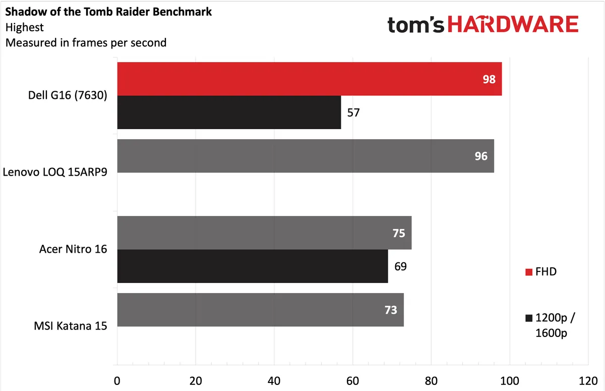 Затем я переключился на наш стандартный набор игровых бенчмарков, состоящий из Shadow of the Tomb Raider, Cyberpunk 2077, Far Cry 6, Red Dead Redemption 2 и Borderlands 3. Начнём с Shadow of the Tomb Raider (максимальные настройки). G16 опередил всех конкурентов, показав 98 кадров в секунду при разрешении 1080p, но опередил следующего по скорости LOQ всего на 2 кадра в секунду. При родном разрешении 1600p производительность упала до 57 кадров в секунду.