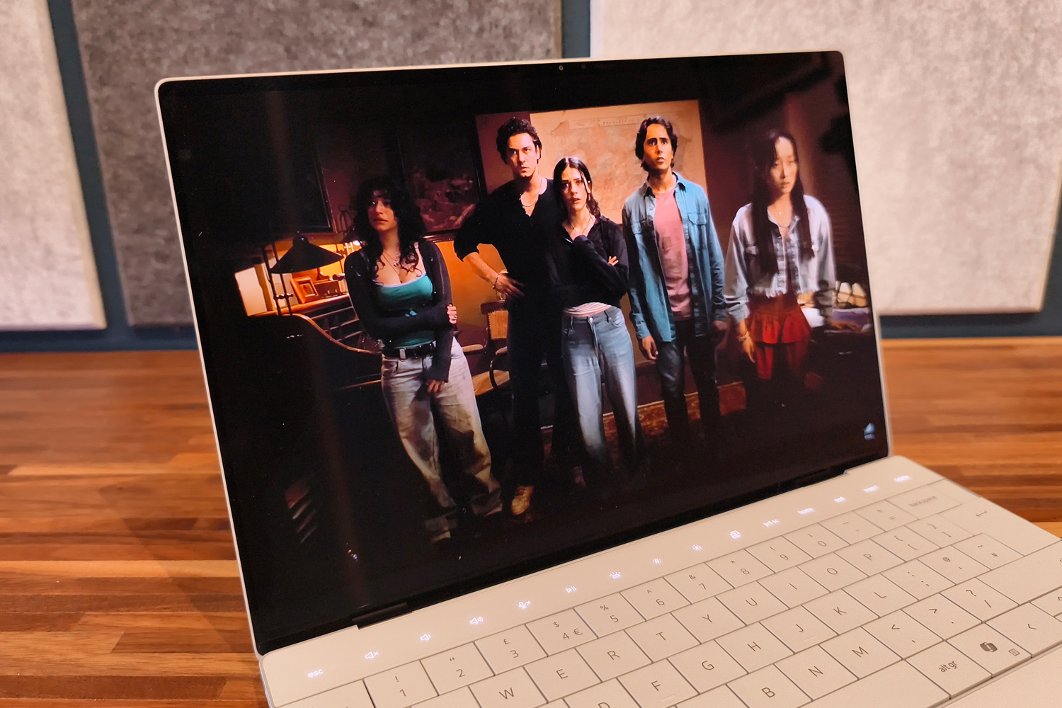 После открытия крышки на своем месте остается та самая спорная емкостная сенсорная полоса, заменяющая традиционные функциональные клавиши и подсвечивающаяся в тон белой светодиодной подсветке клавиатуры. Сама клавиатура расположена от края до края, не оставляя места для направленных вверх динамиков, как в более крупном XPS 14.